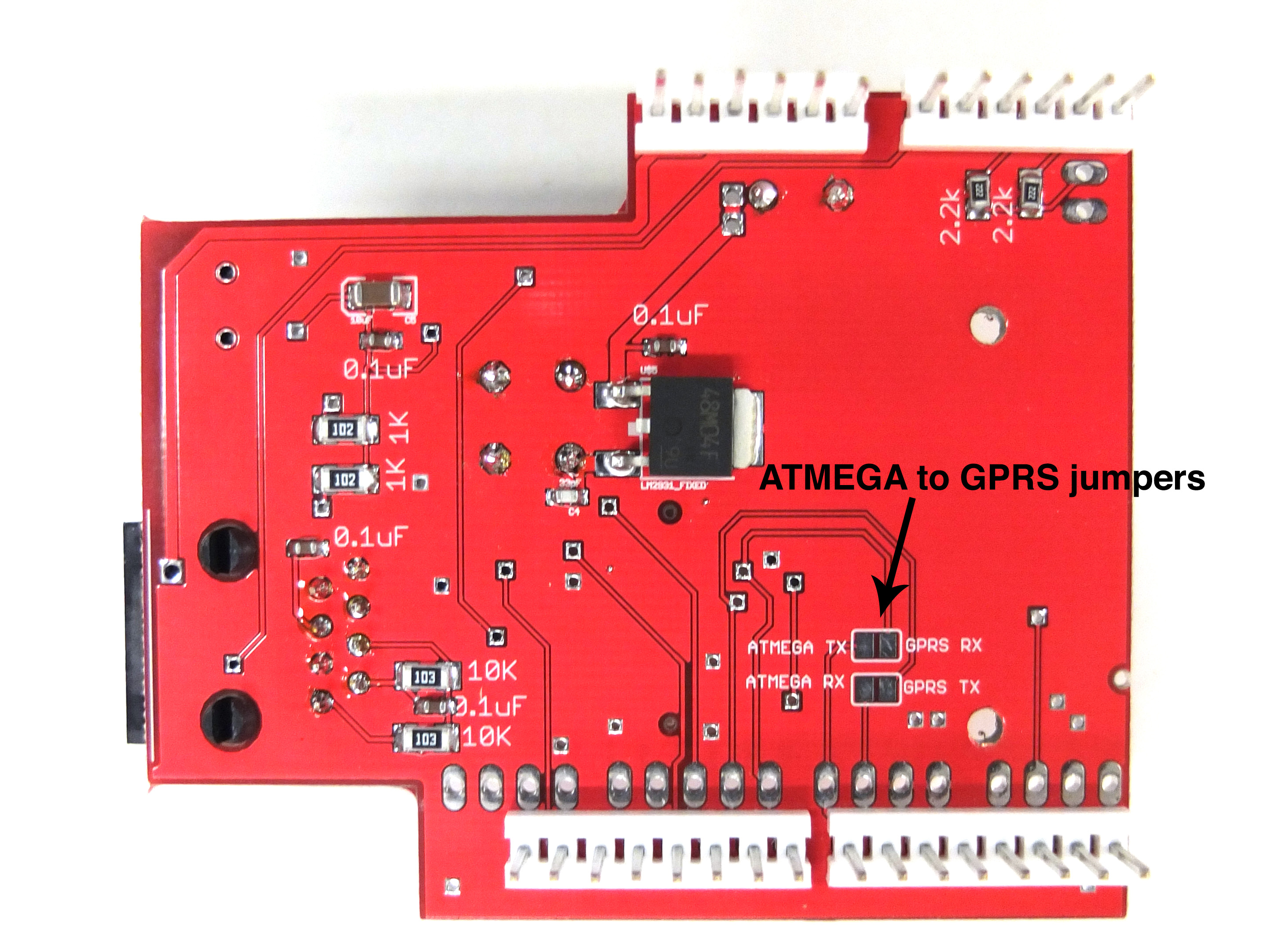 There are solder jumpers connecting ATMEGA RX/TX <-> GPRS TX/RX on the rear of the board. All connections are also printed on the PCB silkscreen (click image to enlarge).