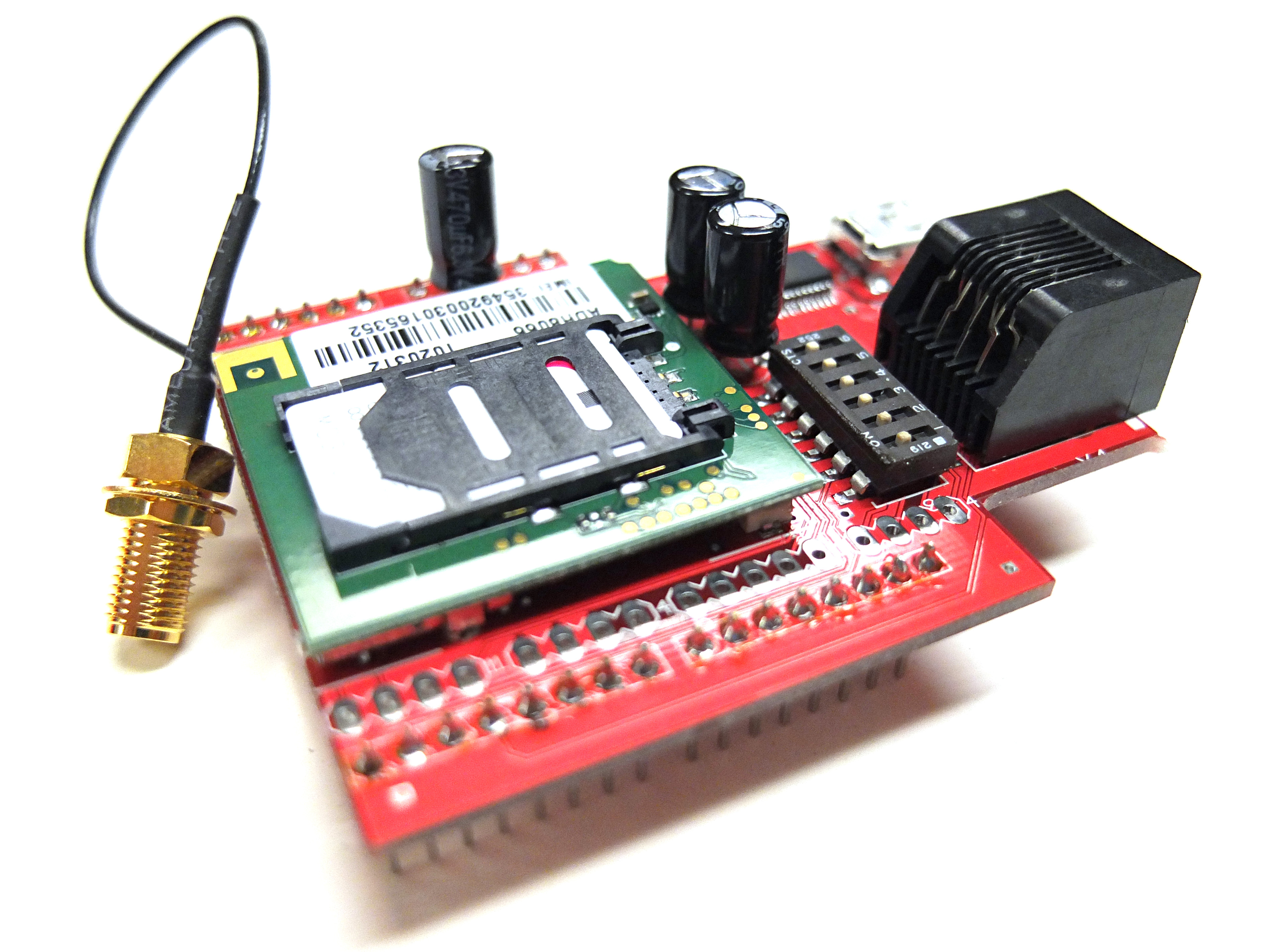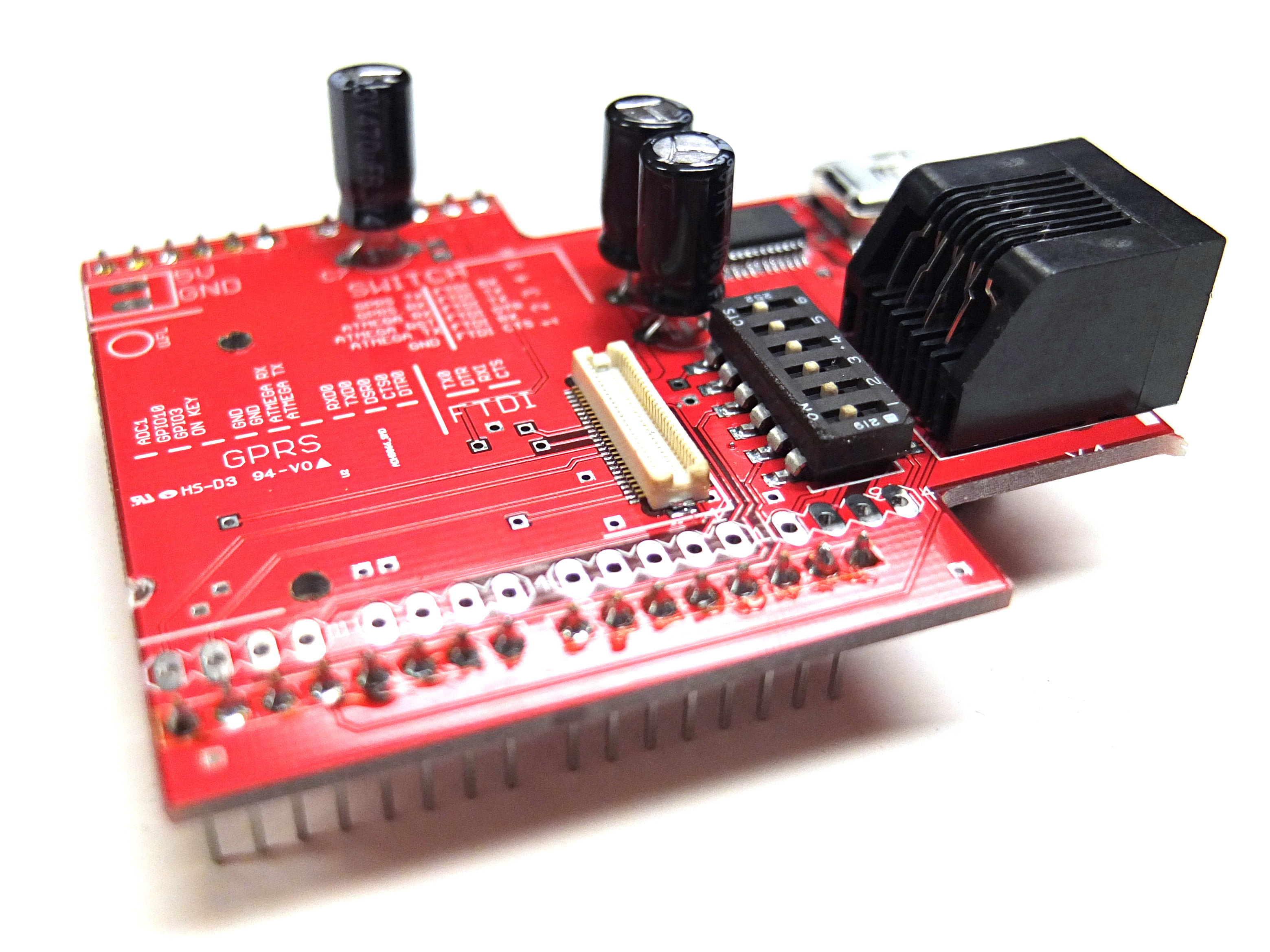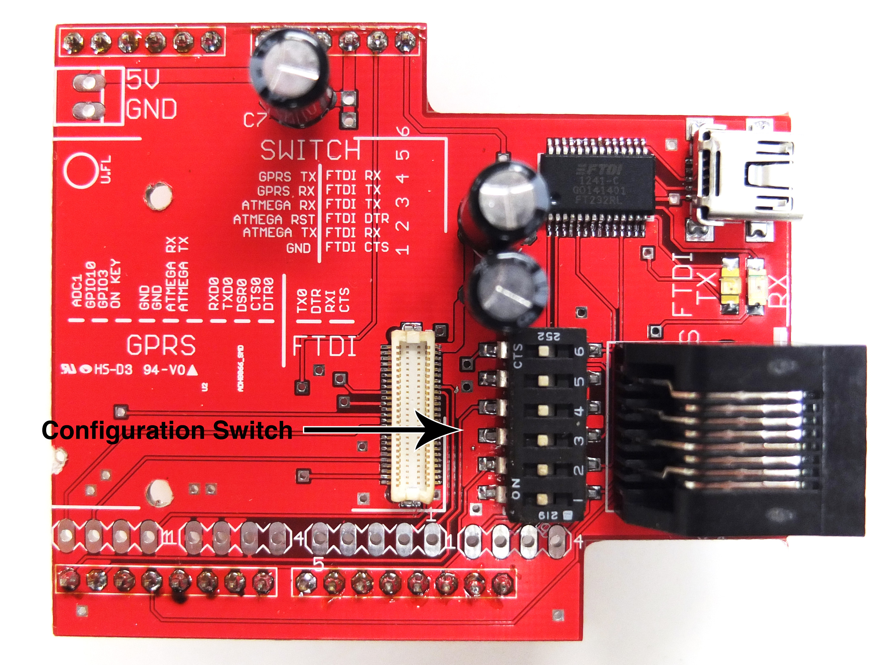 An FTDI chip allows for serial communication with the GPRS/GSM module or the UPOD using a USB connection to an external computer. The communication pathway is selectable using a 6 channel dip switch and solder jumpers on the rear of the board. The USB connection can also be used to upload code onto the UPOD.