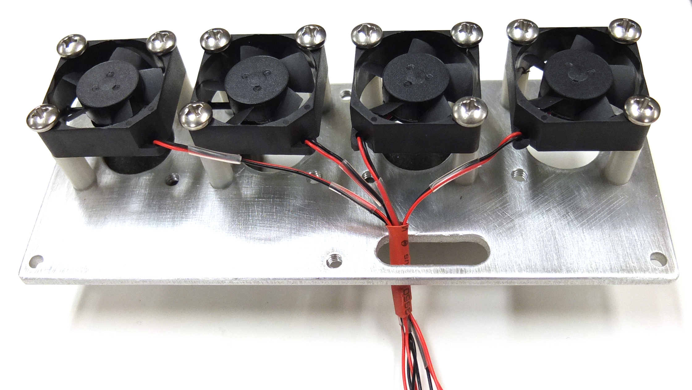 | The QuadStat can be outfitted with an aluminum top-plate and fan assembly. The fan assembly has the added benefit of reducing the boundary layer on the surface of the sensor, resulting in increased sensitivity and less variability due to local airflow patterns. The aluminum plate, which is secured to the PCB via aluminum standoffs, acts as a Faraday cage, grounding the entire assembly and helping to reduce noise due to transient EMF. The build files for the QuadStat include the *.dxf drawing for the aluminum plate, which be cut at any waterjet facility. The bill of materials for the electronics include the four fans. A separate parts list includes the appropriate stand-offs and fasteners. The fans are powered through screw terminals on the QuadStat board. |
