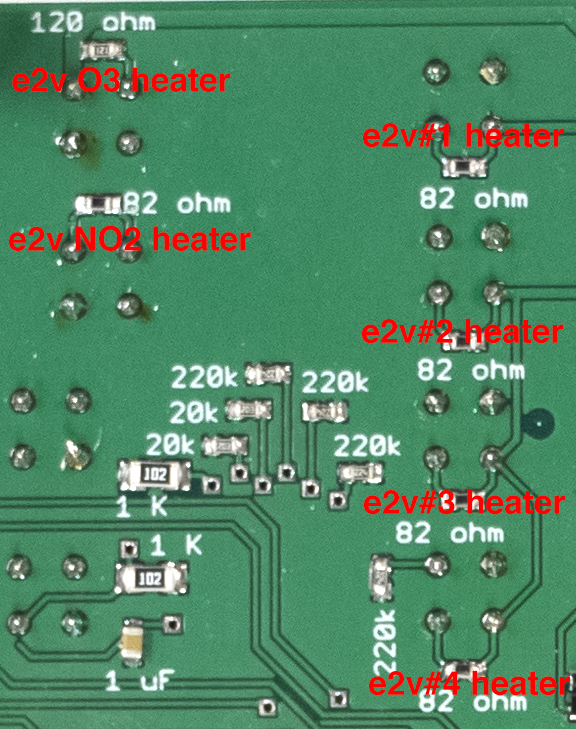 | The UPOD is compatible with many varieties of metal-oxide type sensor. You may, however, need to change the signal and heater resistors on the rear of the board. The UPOD is by default configured to accomodate an e2v NO2 sensor, an e2v O3 sensor and four generic e2v sensors (typically the CO sensor or CO/VOC sensor) |