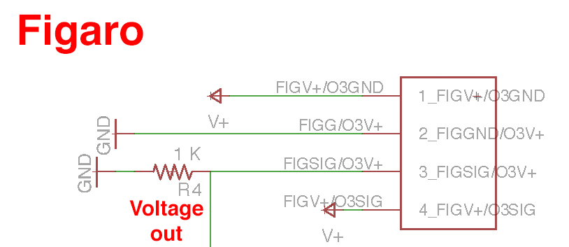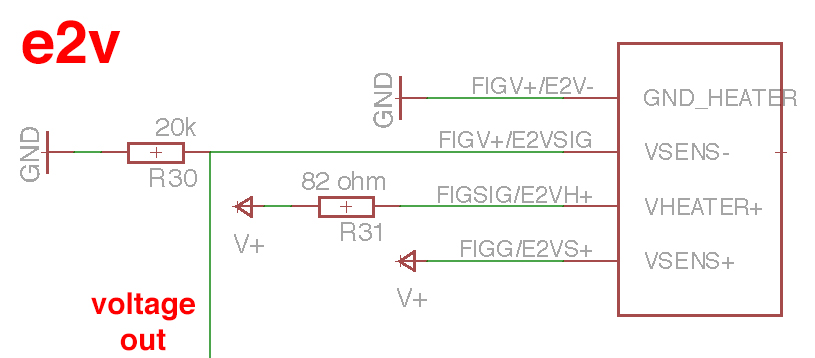 The Figaro sensors (eg. methane) do not have a voltage divider on the heater. As such, a full 5V is dropped across the heater. The voltage output of the figaro sensor is is dropped across a 1K ohm resistor. The e2v sensors use a voltage divider to decrease the voltage dropped across the heater element. The default values on the UPOD were found to work well with their respective sensors. The voltage output is also dropped across a suitable resistor.